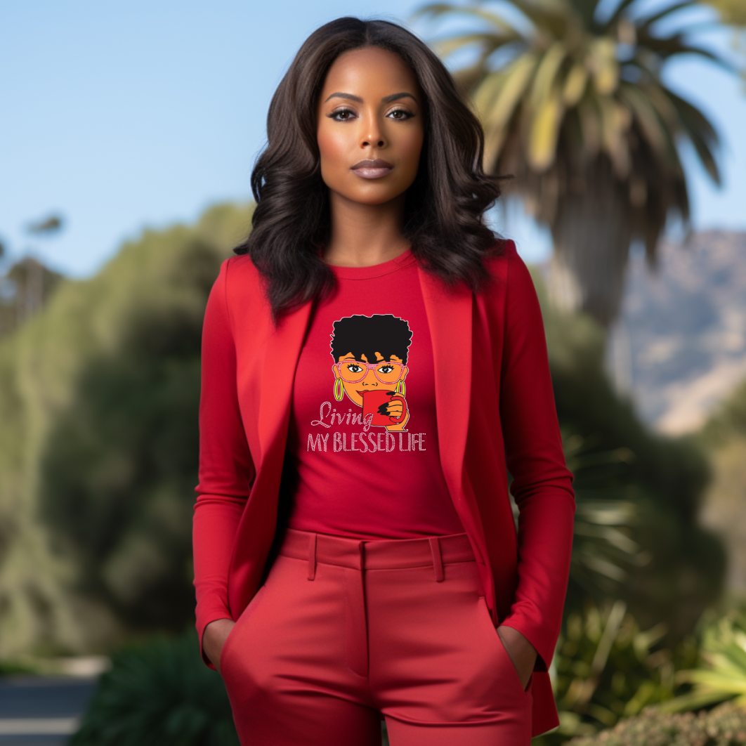 "LIVING MY BLESSED LIFE" t-shirt symbolizes a serene, unbothered spirit, acknowledging that every challenge is a stepping stone and every blessing is a testament to God's grace.