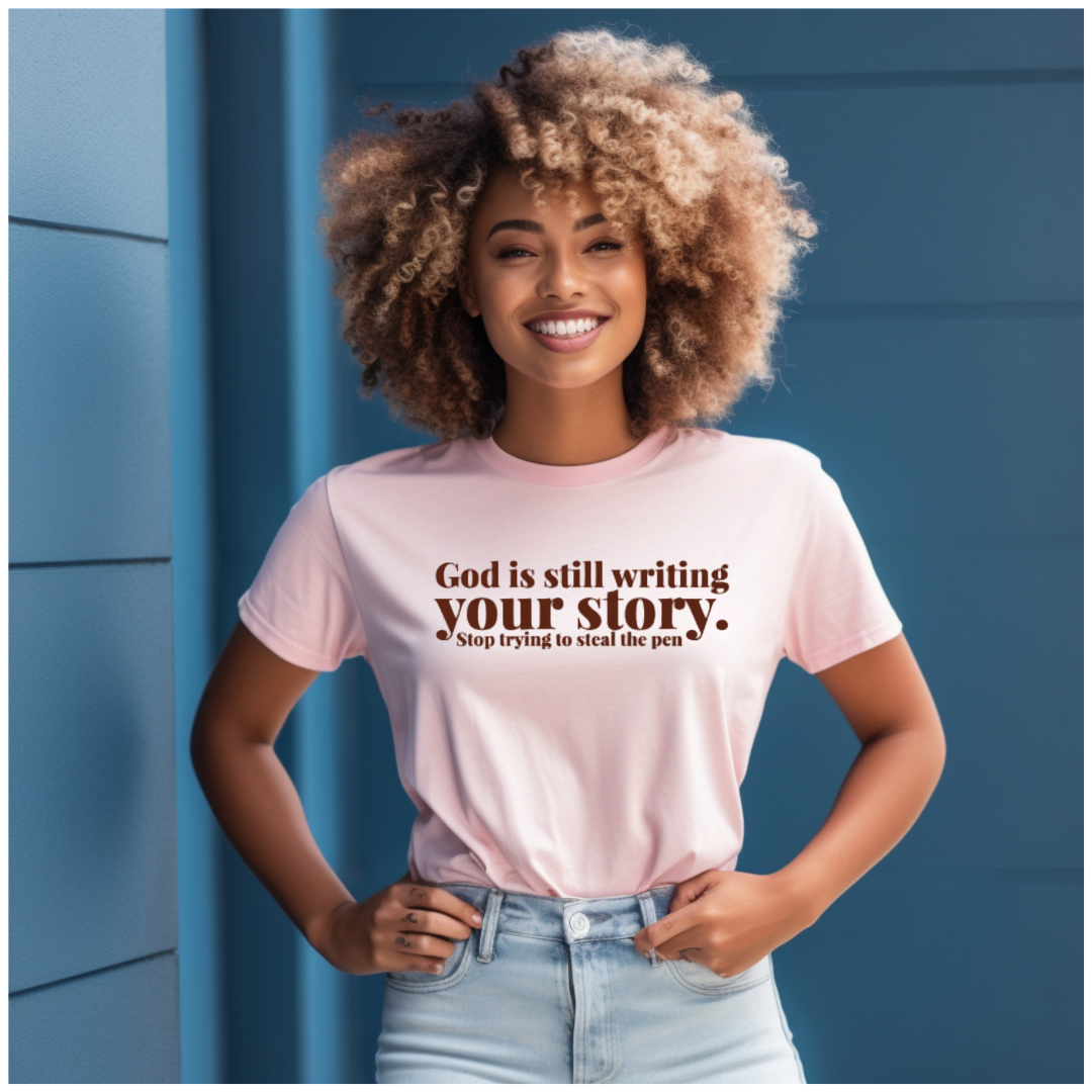 "GOD IS STILL WRITING YOUR STORY" t-shirt is a great reminder to put down the pen and let the Author of life take the lead (after all, He’s the only one qualified to write the greatest story ever told!) GIVE GOD THE PEN BACK-HE got this on